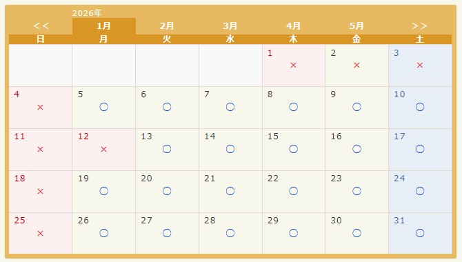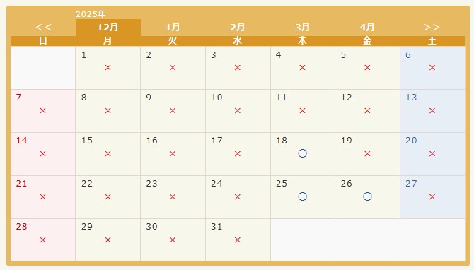 ※ リアルタイム反映ではございませんので、○であってもご予約いただけない場合があります。