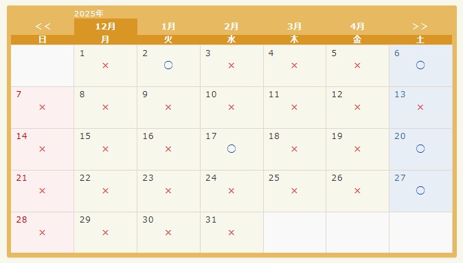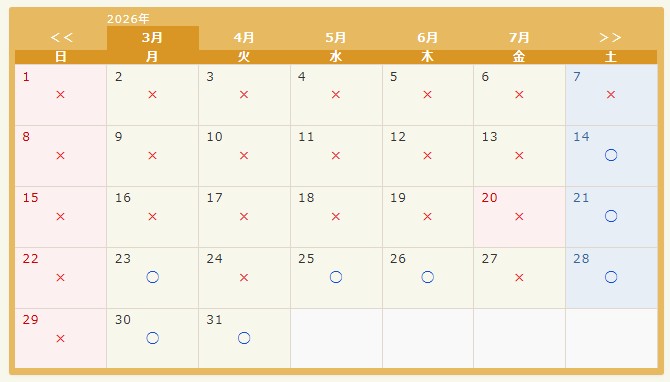 ※ リアルタイム反映ではございませんので、○であってもご予約いただけない場合があります。
