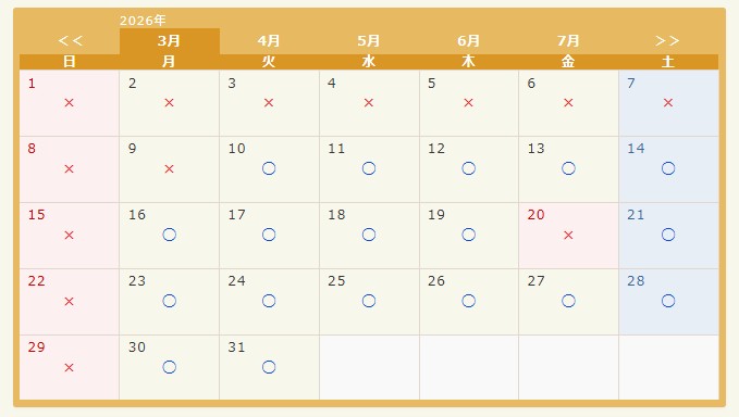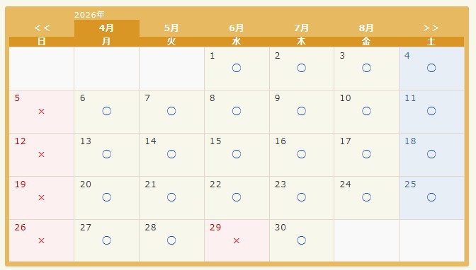 ※ リアルタイム反映ではございませんので、○であってもご予約いただけない場合があります。